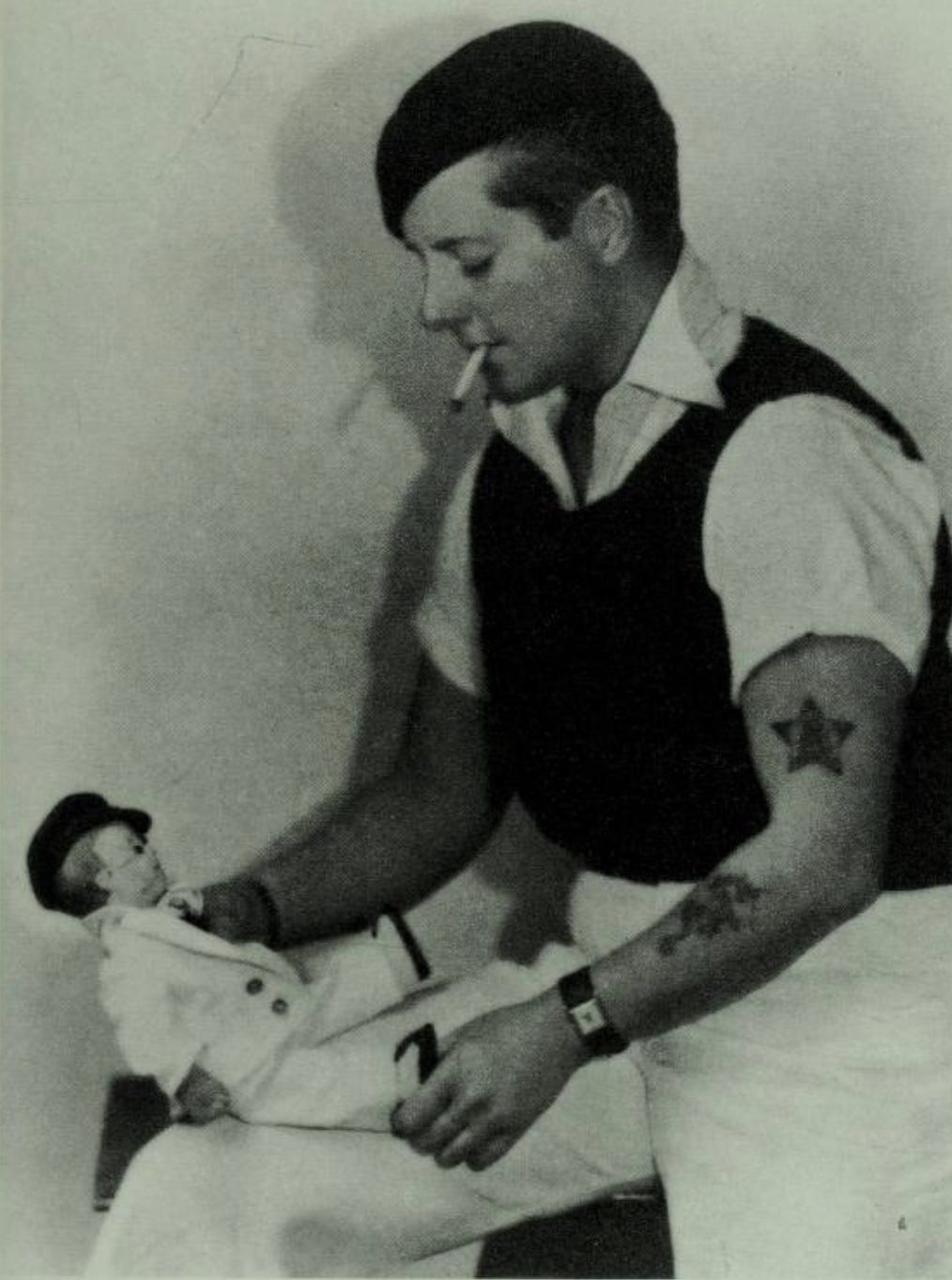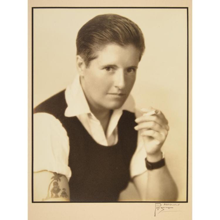 24:33 Around this time, Joe got drunk one night (or, as she described it,“awfully scratched”) and decided to get her arms tattooed. She then sat with Wadley for a photo: she sat in profile, showing off her new tattoos of stars and dragons, a cigarette in her mouth and a beret on her head. Wadley sat on her knee, meeting Joe’s gaze with a child’s smile.