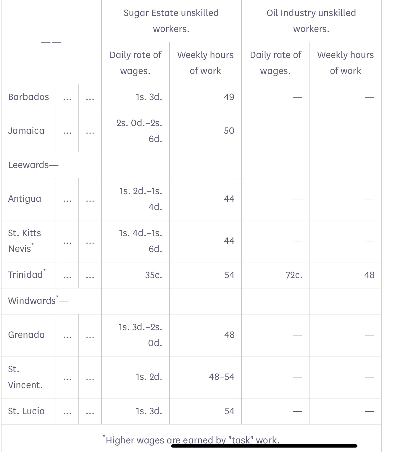 34:40 I want to note this because it’s a way that Joe was treating her employees differently from the way the British government was paying employees in the British West Indies in the late 1930s. Between 1934 and 1939 they had several bouts of unrest brought on in large part by the low wages they were paying their sugar plantation workers. As a reminder, Britain had enslaved the Caribbean peoples until the 1830s. Treatment of them had obviously improved some after slavery ended, but a hundred years later wages were still incredibly low. I found a transcript from a House of Commons debate on February 9, 1938, which included a wage table showing how much money workers in the oil and sugar industries in the West Indies were paid daily. The numbers vary by island, but sugar estate workers could be paid as little as 1 shilling and 2 pence per day or as high as 2 shillings and 9 pence per day. People probably worked 6 days a week with rest on Sunday, so that range calculated weekly looks like 7 shillings per week, which is less than half of one British pound, to around 16 shillings and 6 pence per week at the very highest. 16 shillings is just over two-thirds of a British pound. So workers in British government plantations in the Caribbean had to work a minimum of 8 days to earn 1 British pound.