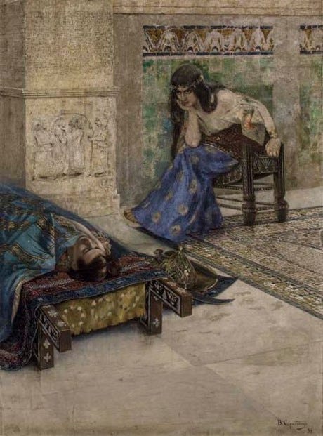 5:02 At first, Ninus was amazed and grateful to this woman who had basically single-handedly won him this conquest when all his trusted generals couldn’t. And then, the more he got to know her, he fell in love with her. He approached Onnes and begged him to allow Ninus to marry her, even offering his own daughter’s hand in marriage, which would have made Onnes a prince who could have inherited the throne himself someday. But Onnes was not impressed and loved his wife, so he said no. So then Ninus threatened to “put out his eyes” if Onnes didn’t give up Semiramis.6 Onnes, either out of fear or love, hanged himself and Ninus was free to marry Semiramis. She was now queen of the Empire of Assyria.